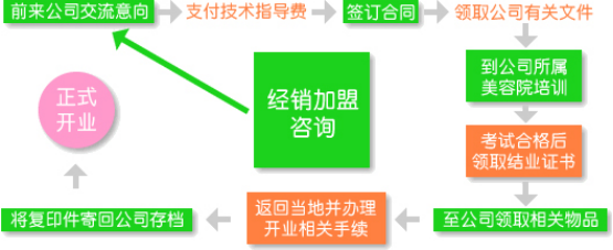 經(jīng)銷加盟咨詢→前來(lái)公司交流意向→支付技術(shù)指導(dǎo)費(fèi)→簽訂合同→領(lǐng)取公司有關(guān)文件→到公司所屬美容院培訓(xùn)→考試合格后領(lǐng)取結(jié)業(yè)證書(shū)→至公司領(lǐng)取相關(guān)物品→返回當(dāng)?shù)夭⑥k理開(kāi)業(yè)相關(guān)手續(xù)→將復(fù)印件寄回公司存檔→正式開(kāi)業(yè)